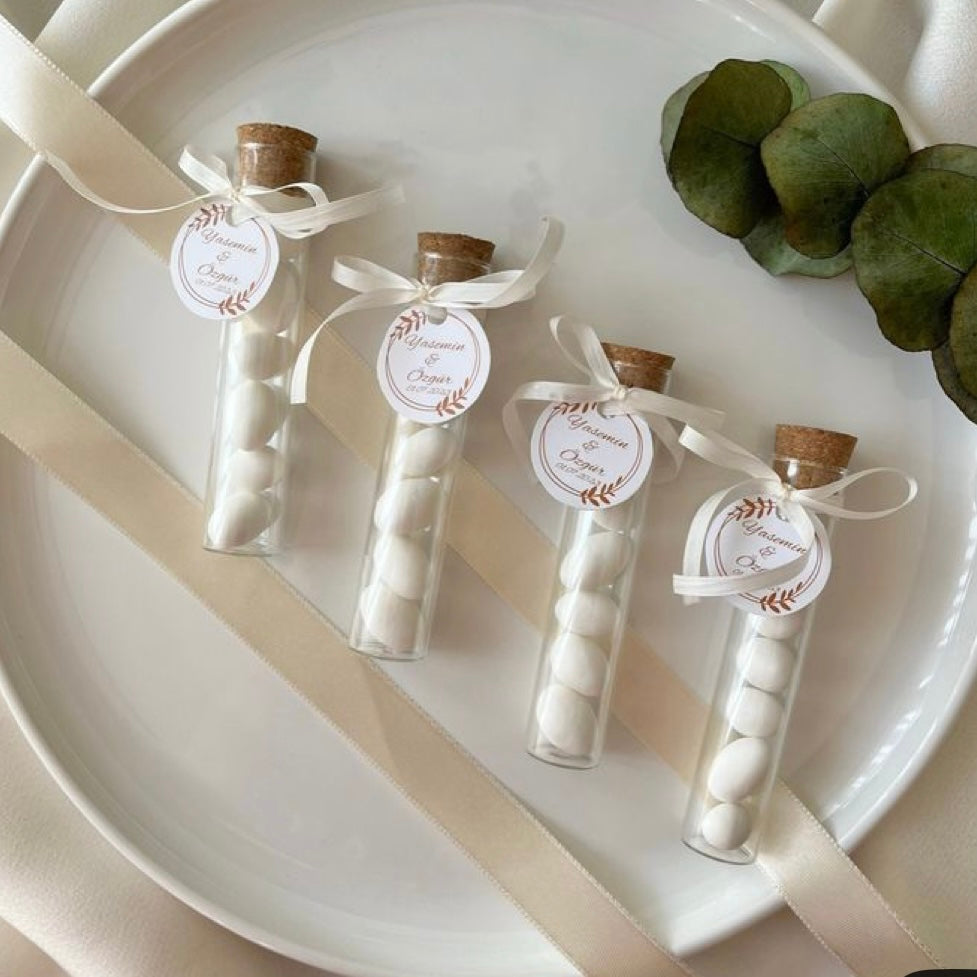 Tubengläser für Mandelbonbons für Neugeborene mit Etikett